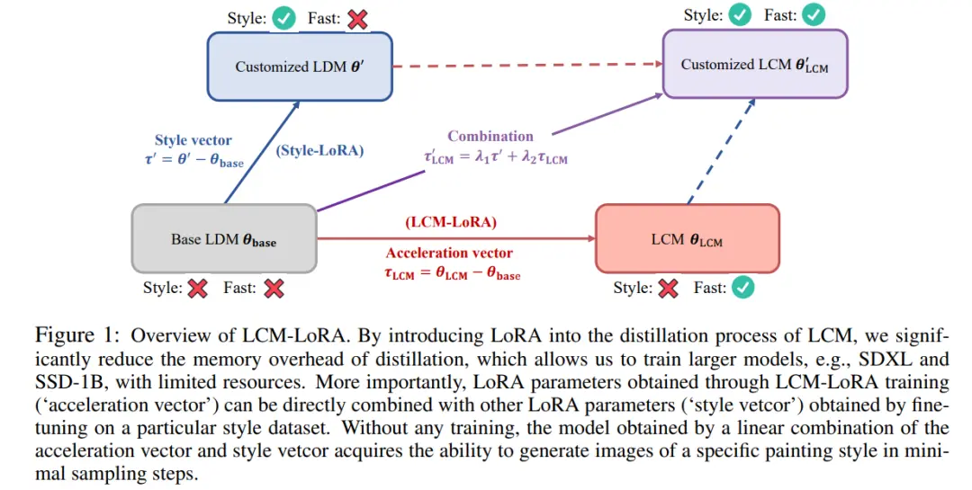 LCM-LoRA 概况图。通过在 LCM 的蒸馏过程中引入 LoRA,该研究大大减少了蒸馏的内存开销,这使得他们能够利用有限的资源训练更大的模型,例如 SDXL 和 SSD-1B。更重要的是,通过 LCM-LoRA 训练获得的 LoRA 参数(acceleration vector)可以直接与在特定风格数据集上微调获得的其他 LoRA 参数(style vetcor)相结合。无需任何训练,通过 acceleration vector 和 style vetcor 的线性组合获得的模型就能以最少的采样步骤生成特定绘画风格的图像。