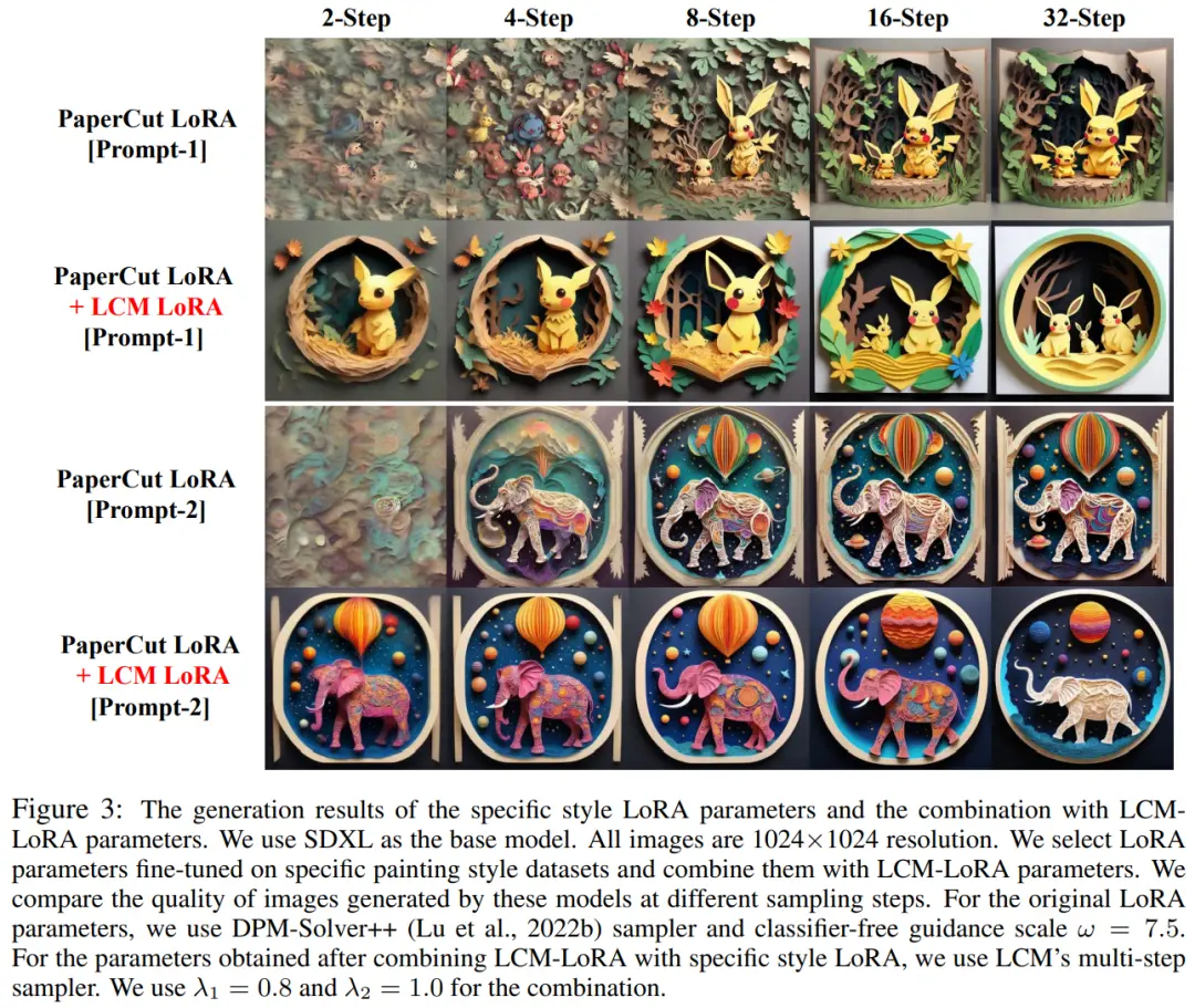 除了使用 LoRA 技术来让蒸馏过程更加高效,作者还发现了由此训练得到的 LoRA 参数可以被作为一种泛用的加速模块,直接与其他 LoRA 参数结合。