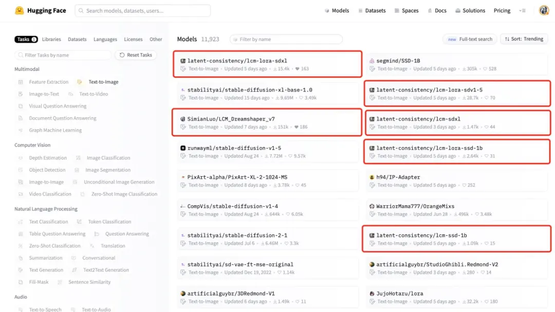 作者团队现已完全开源 LCM 的代码,并开放了基于 SD-v1.5、SDXL 等预训练模型在内蒸馏得到的模型权重文件和在线 demo。此外,Hugging Face 团队已经将潜在一致性模型集成进入 diffusers 官方仓库,并在两个接连的正式版本 v0.22.0 和 v0.23.0 中先后更新了 LCM 和 LCM-LoRA 的相关代码框架,提供了对潜在一致性模型的良好支持。在 Hugging Face 上开放的模型在今日的热度榜中达到全平台文生图模型热度第一,全类别模型热度第三。