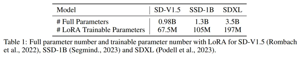 下表将完整模型中的参数总数与使用 LoRA 技术时的可训练参数进行了比较。显然,通过在 LCM 蒸馏过程中结合 LoRA 技术,可训练参数的数量显着减少,有效降低了训练的内存需求。