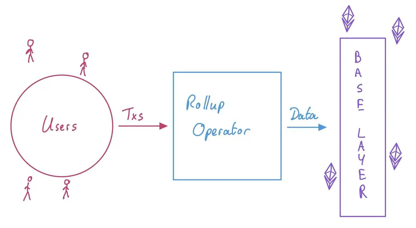 据以太坊基金会研究科学家@barnabemonnot 的解释说明,我们可在 Rollup 系统中分出三个主要角色:用户、Rollup 运营商和基础层。他们运行的主要流程大致为:当用户在 L2 上进行交易,Rollup 运营商充当着用户和基础层之间的接口角色,并最终将数据发布到基础层,如下所示: