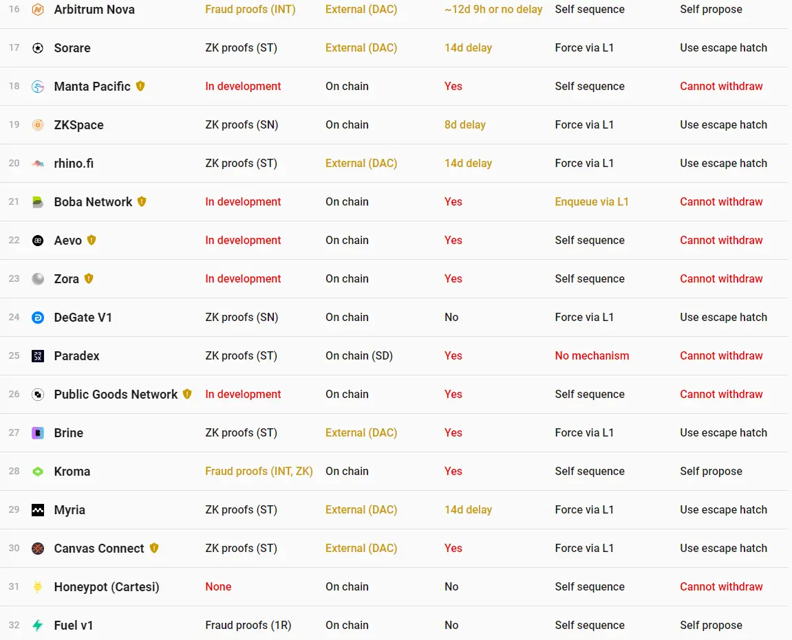 目前 L2 中排序器都是中心化的,但去中心化排序器在未来也尤为重要,从意识形态的角度来看,在存在信任假设的前提下,单一的中心化排序器并不可取。不过排序器并非必不可缺,它只是 Rullup 在设计上的选择,因目前暂未有全新方案替且如今 Rollup 均采用中心化的排序方式来解决交易排序问题,当下 Rollup 的实际进展由下图 L2BEAT 官方数据所示。