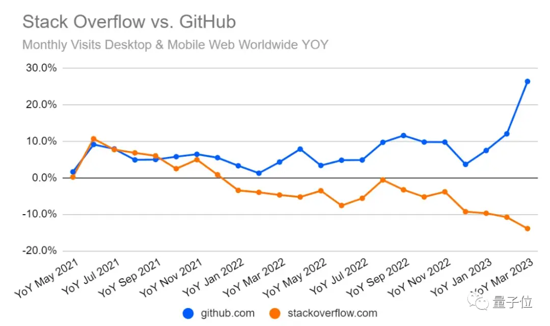 同样是“2023 AI现状报告”中,一张StackOverflow与GitHub的网站流量对比图,可以说明一些问题: