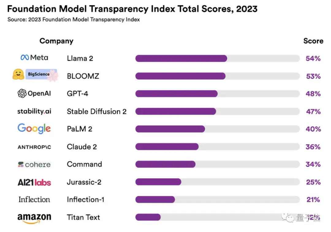 大模型透明度越来越低,透明度最高的是Llama 2,但得分也仅有54;