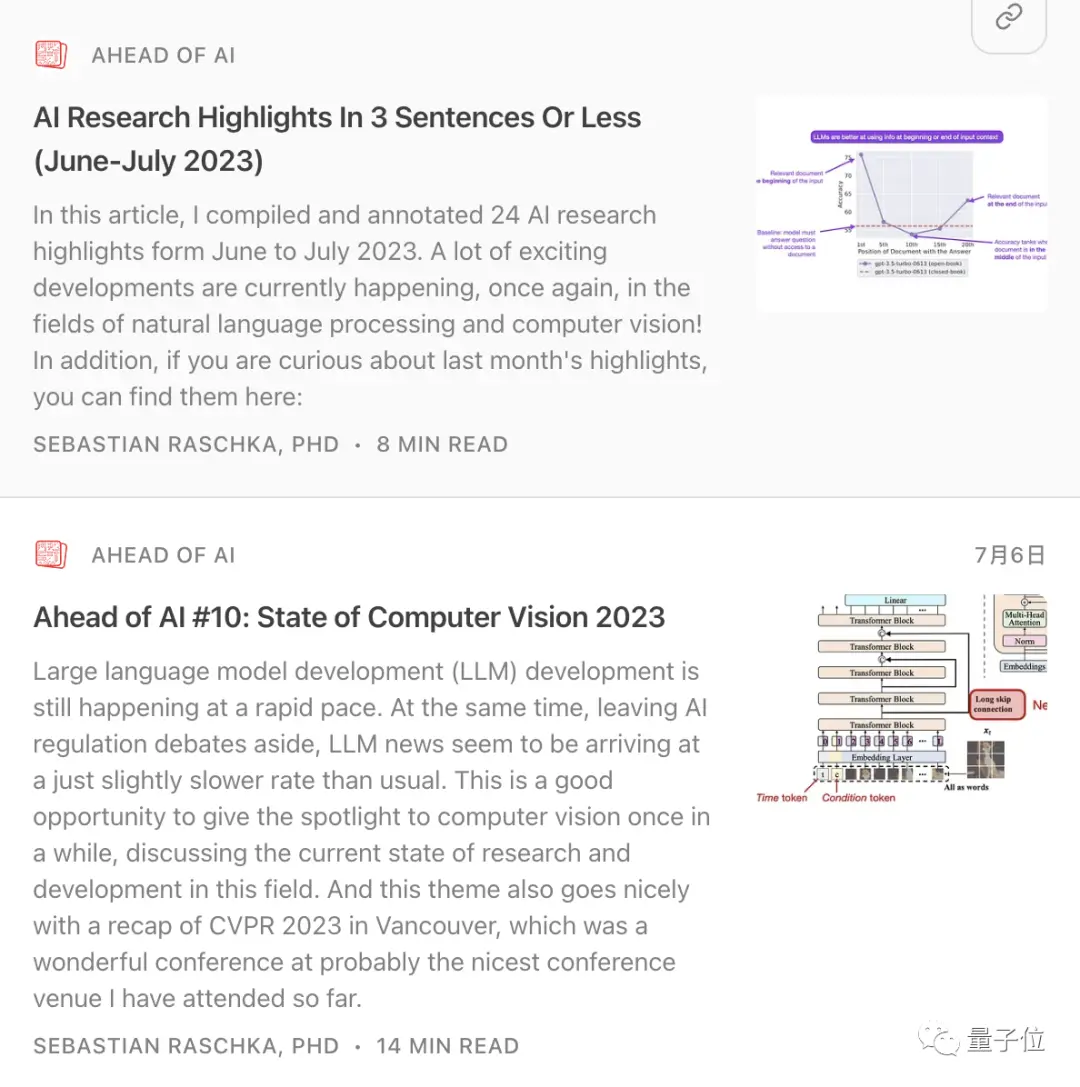 他经常在自己的AI博客Ahead of AI中总结AI领域的各项研究,已揽获大波粉丝。