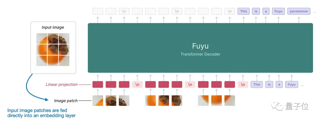 Fuyu-8B在处理图像时,直接将图像切成小块,然后把这些小块输入到一个线性投影层,在这一层里面自动学习小块的向量表示,避免用额外的预训练编码器来提取图像特征,简化了模型架构和训练过程。