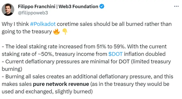 10 月 26 日,Web3 基金会的技术教育工作者 Filippo Franchini 在 X(原 Twitter)发布了一篇推文,表示赞成烧毁所有波卡核时间(Coretime)销售所产生的收入。