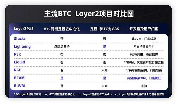 由于比特币区块链是非图灵完备的且不支持智能合约,因此,多年来一直都有创业团队在进行比特币Layer2的探索。BTC Layer2的本质就是以去中心化的方式让BTC跳脱出Layer1的束缚,让BTC可以在高性能、高拓展性的Layer2上实现一切复杂的应用场景。因此,一个优秀的能落地的比特币Layer2应该遵循一些最基本的设计原则,比如,是否以去中心化的方式把BTC跨链到Layer2,这决定了Layer2的市场规模和价值上限;是否以BTC为GAS,这决定了Layer2是否能得到比特币社区的共识和支持;开发语言和基础设施是否对开发者和用户足够友好,这决定了Layer2的生态是否能够快速成长壮大。