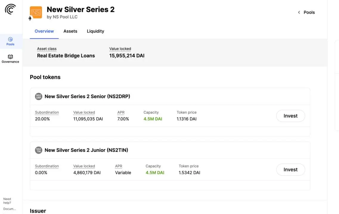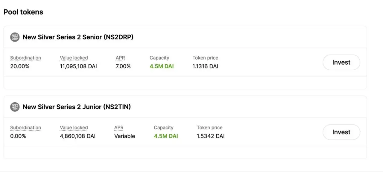 投资者需要用 DAI 购买 DROP 和 TIN 代币。持有 DROP 代币,在资产池的利润分配中享有优先权,享受固定利率;且在风险(例如贷款违约)发生时,后承担损失,通常具有较低的风险和较低的回报。比如 New Silve 的 DROP 代币持有者,就享受 7% 的固定利率。持有 TIN 代币,则后享受利润分配,利率是浮动的,但需要先承担损失,通常具有较高回报和风险。