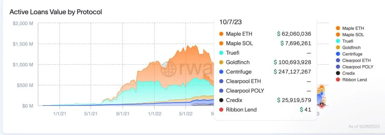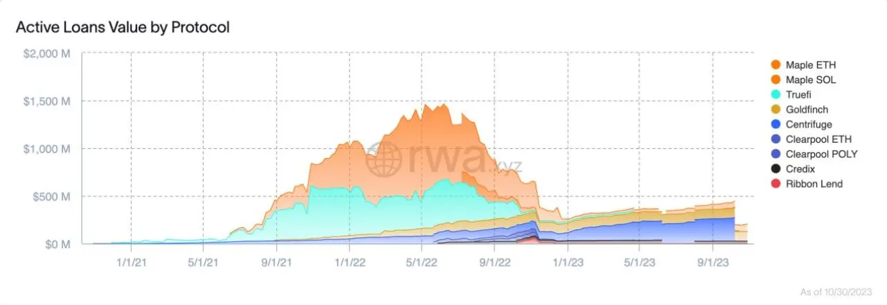 而相比于 Maple,最早就致力于以真实世界资产抵押借贷的 Centrifuge,则增长更为显著。目前 Centrifuge 链上活跃贷款已增长至超 2.4 亿美元,比年初增长近 3 倍,成为了目前链上信用贷款最大的协议。