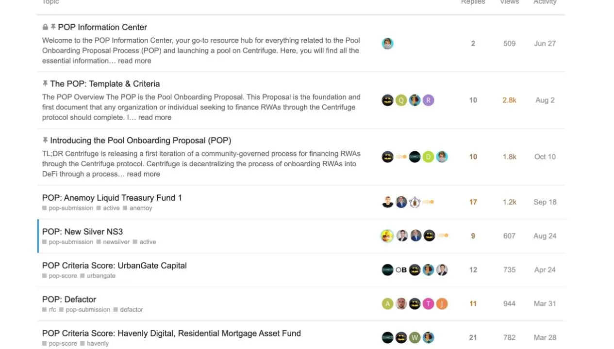 New Silver 作为资产需求方,首先需要在 Centrifuge 论坛上发起池子入选提案 (POP),写清楚自己是干什么的,信用情况以及资金的用途等等。(不过目前论坛上公示的 POP 似乎不全,New Silver Series 2 的池子申请提案就没有看到。)