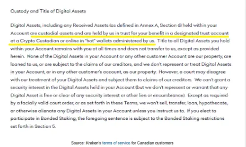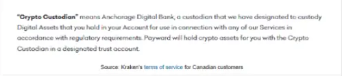 下划线的文字意思是,如果你是加拿大人,Kraken 并不为你持有你的加密货币。这与美国的情况非常不同。相反,Kraken 表示,客户的加密货币被视为「托管资产」,并将你的加密货币委托给一个「指定的信托账户在一个加密货币托管人处」。就是了。这就是我之前提到的交易与保管的分离,这符合市场的标准做法。