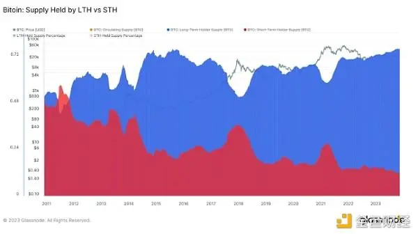 LTH 和 STH 之间的区别对于理解市场情绪和潜在的未来走势很有价值。 例如,占主导地位的 LTH 供应通常与积累阶段相关,经验丰富的投资者会购买并持有,并预计未来价格上涨。 相反,STH 供应量的增加可能预示着市场活动加剧和潜在的抛售压力,这在牛市中经常出现。