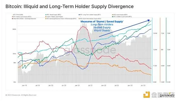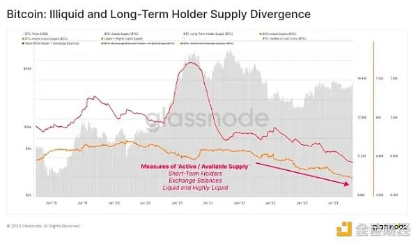 比特币:非流动性和长期持有者供应分化