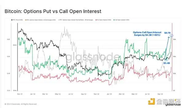 同样,机构参与在期权市场也很明显。 10 月份,比特币看涨期权的未平仓合约激增 43 亿美元,增长 80%,超过 97 亿美元。 期权市场的活动规模如此之大,目前可与期货市场相媲美,这标志着市场的成熟。 它反映了一种更复杂的投资策略,通常与专业和机构交易者相关,他们越来越多地利用这些工具来长期投资比特币。