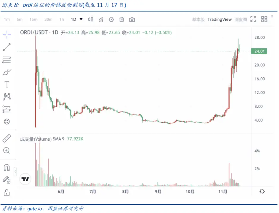 目前来看,主导 BRC-20 通证价格的更多是市场情绪,并无场景支撑,因此类似 ordi 通证价格波动剧烈。