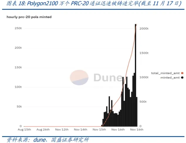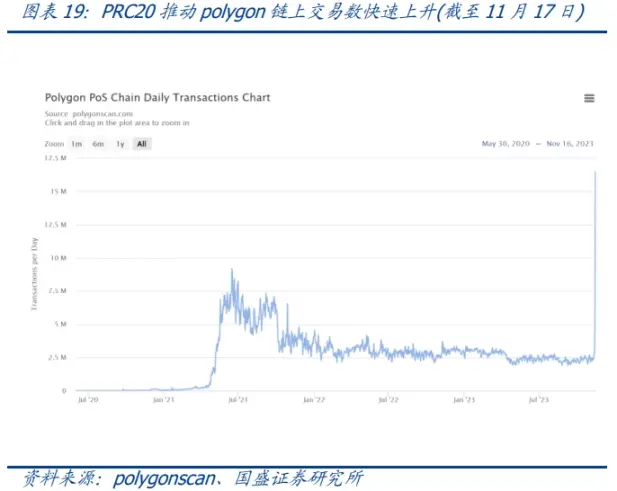 **以太坊 EVM 系统生态不甘于落后于每一次创新。**11 月 14 日至 11 月 15 日期间,以太坊 EVM 生态重要的区块链——Polygon 的链上交易数量从 289 万笔飙升至 617 万笔,此后持续走高,甚至创历史新高,推动网络交易费用快速上升。纵观社区活动,近几日诞生了一种名为「POLS」的新型通证被集中铸造,可以理解为 Polygon 上的「BRC-20」标准——即 PRC-20 通证标准——也就是 Polygon 区块链上的 Ordinals 协议生态。注意这些通证并不是基于 ERC-20 标准,而是通过 Polygon 区块链交易中的「calldata」功能创建的,模仿了比特币网路的 Satoshi(Sats)上铭文铸造方式。在短短时间里,2100 万张 POLS 被迅速铸造完毕。