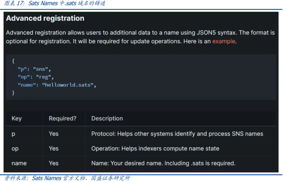 对于基于 Ordinals 的域名,目前存在两个较为流行项目,分别是 Sats Names 和 BTCDomain。Sats Names 可以铸造.sats 的域名而 BTCDomain 可以铸造「.btc」的域名。由于它们是基于 Ordinals 协议的域名,域名的铸造过程也与 Ordinals NFT 的铸造过程类似,不过铭刻的内容是一段被格式化的 JSON 文本。铸造完成后,用户的域名数据就将完整的储存在比特币网络中,用户也可以通过解码的方式对域名数据进行验证。以下是一个在 Sats Names 上铸造「.sats」域名的例子,可以发现它与 BRC-20 的铸造过程十分类似。