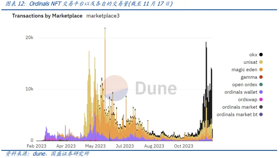 由于市场对于 Ordinals NFT 存在交易需求,这推动了面对 Ordinals NFT 的交易平台的诞生。目前,比较流行的几个 Ordinals NFT 交易平台分别是 unisat、ordinals wallet 和 magiceden。根据 dune 显示的数据,5 月以来 Ordinals NFT 的日交易量峰值已经超过了 1.5 万笔,其中在 11 月之前,unisat 所占份额最多,ordinals wallet 和 magic eden 的份额紧随其后。随着 10 月底 BRC-20 生态再次火热,OKX 平台迅速崛起,引领又一波的市场热度。