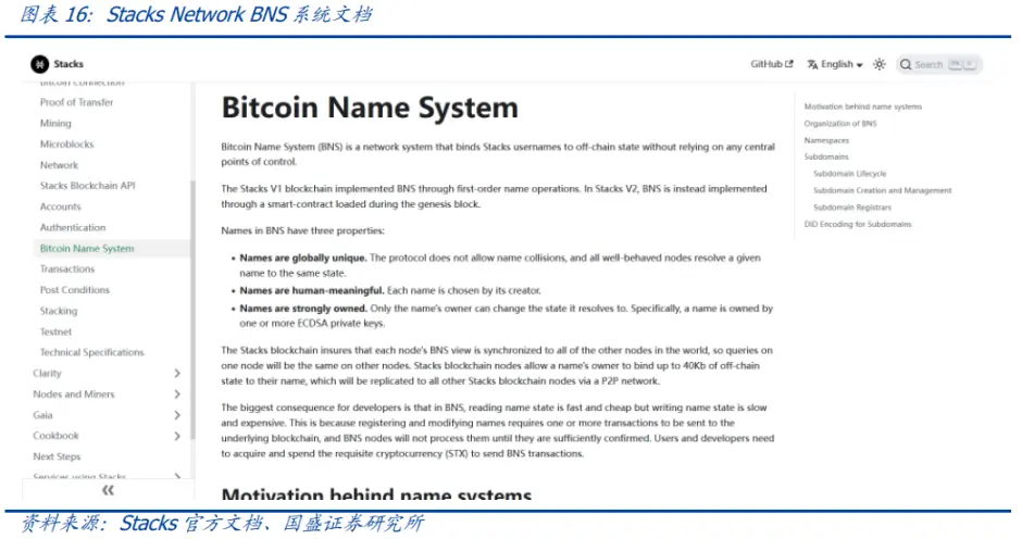 对于基于 Stacks Network 的 BNS(Bitcoin Name ),Stacks 官方文档中显示 BNS 是一种可以不依赖于任何中心节点,而将 Stacks 用户名与链下状态绑定的网络系统。在 BNS 中,协议不允许名称冲突,这意味着名称是全局唯一的;名称具有强所有权,即只有名称的所有者才能更改其解析的状态。另外,由于 Stacks 是一个可以运行智能合约的比特币 L2(二层网络),BNS 的使用能更多地与智能合约相结合。但是需要注意的是,基于 Stacks Network 的 BNS 并不能直接与比特币网络交互。