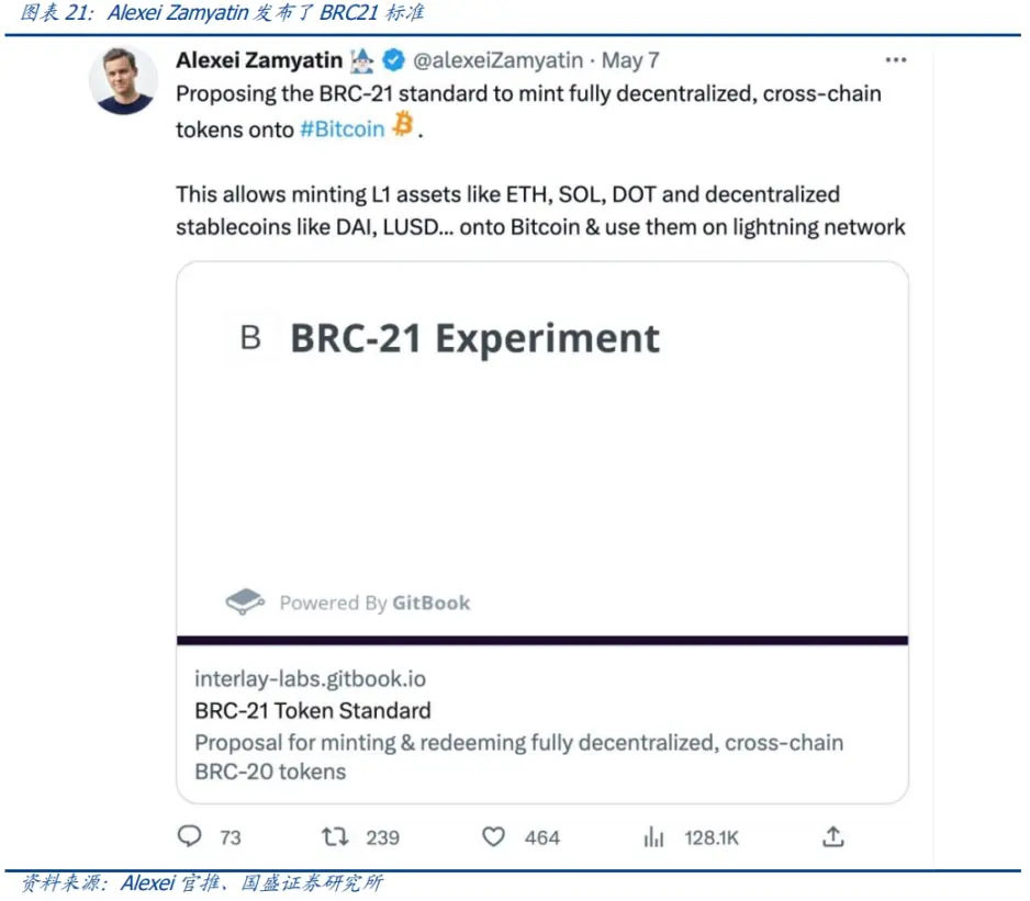 而后面出现的 BRC-21 标准,其本质是一个跨链项目。BRC21 标准由 Interlay 创始人 Alexei Zamyatin 于 5 月 7 日在推特上提议推出,并发布了 BRC-21 标准文档。类似 WBTC 这样的跨链资产是将比特币资产「映射」到以太坊网络,而 BRC21 协议则是将其他去中心化网络的区块链资产(如以太坊网络的 ETH、USDT 以及 SOL 等网络资产)「映射」到比特币网络,使得这些资产可以在闪电网络中使用。
