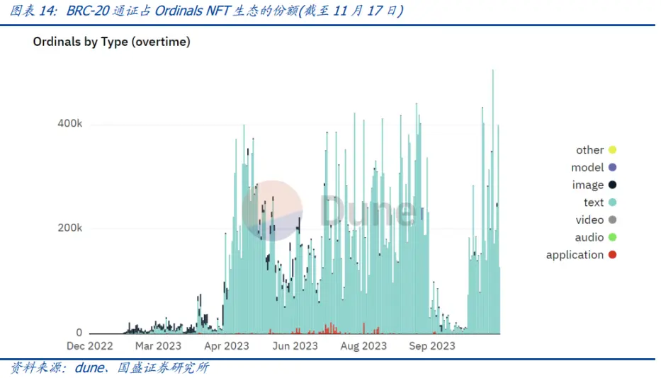 由于 BRC-20 通证实质上是铭刻了文本数据的 Ordinals NFT,且 BRC-20 通证占文本类 Ordinals NFT 的绝大部分,我们可以从铭文的分类数据推断出 BRC-20 通证占整个 Ordinals NFT 生态的份额大小。根据 dune 显示的数据,自 2023 年 3 月 8 日 BRC-20 标准被提出以来,文本类型的 Ordinals NFT 的铸造量急剧上升,在四月末到五月中旬,甚至几乎没有什么图片类的 Ordinals NFT 被铸造,截至 11 月 17 日,过去已经大半年,BRC-20 通证目前仍以文本为绝对的主流。
