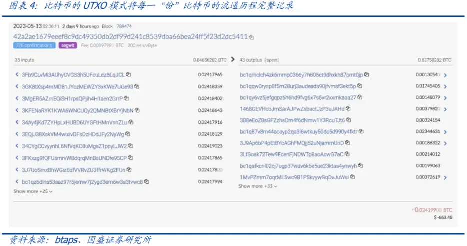 **UTXO 机制使得比特币的每一聪都是「非同质化」的。**由于比特币没有账户,比特币的交易创建的输出其实并非一个简单的公钥地址,而是一个脚本。在 Bob 给 Alice 支付 1.5 个 BTC 的这个交易中,Bob 创建的输出脚本中会包含 Alice 的公钥 Hash。整个脚本的意思是,谁能够提供一个签名让这个包含 Alice 的公钥的脚本运行,谁就能花费这笔交易的 1.5 个 BTC。显然,创建签名只能使用 Alice 的私钥,其他私钥创建的签名将无法通过这个脚本的验证,从而确保其他人无法假冒 Alice 来花费这笔输出。也就是说,UTXO 中的 BTC 并不是以余额的方式记录在某人的账户里——每一笔交易发起者通过脚本为这些 BTC 创建了一个锁,而所有者才有钥匙——当然某笔转账的比特币的输入(转账发起者)和输出(转账接收者)可能是由多个历史 UTXO 组合而成,类似不同面值纸币的拼凑。这样做的好处之一是,所有的转账交易都是站在 BTC 流转的角度,不同的 UTXO 之间可以进行并行交易,因为 UTXO 之间是严格区别的。也可以这样理解:UTXO 机制将 BTC 的所有部分(最小单位是「聪」,sats)的流转历程完整记录下来,可以想象每一聪就是一个硬币,在每次流转都获得一个签章来记录轮流历程。这使得每一聪 BTC 的流转都是可追溯的,非同质化的(也许这是最早的 NFT),这为开发 Ordinals 协议以及 BRC-20 生态提供了基础。