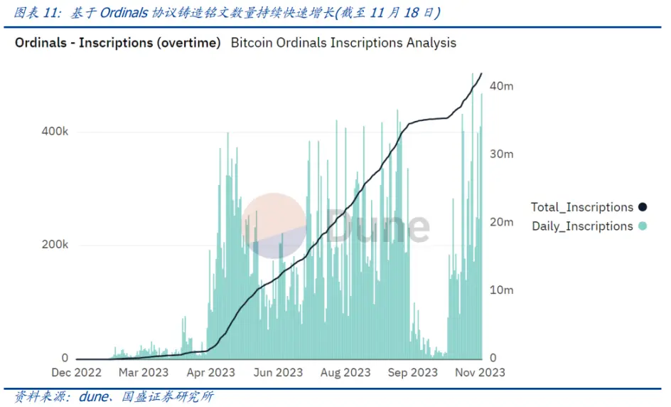 根据 dune 显示的数据,自 2022 年 Ordinals 协议发布以来,比特币 Ordinals 铭文的铸造量快速增长,而近一个月铸造的增长量更是惊人。截至 2023 年 11 月 18 日,单日比特币铭文的铸造量峰值达超过 41 万个,而比特币铭文的总铸造量已经接近 4200 万个。