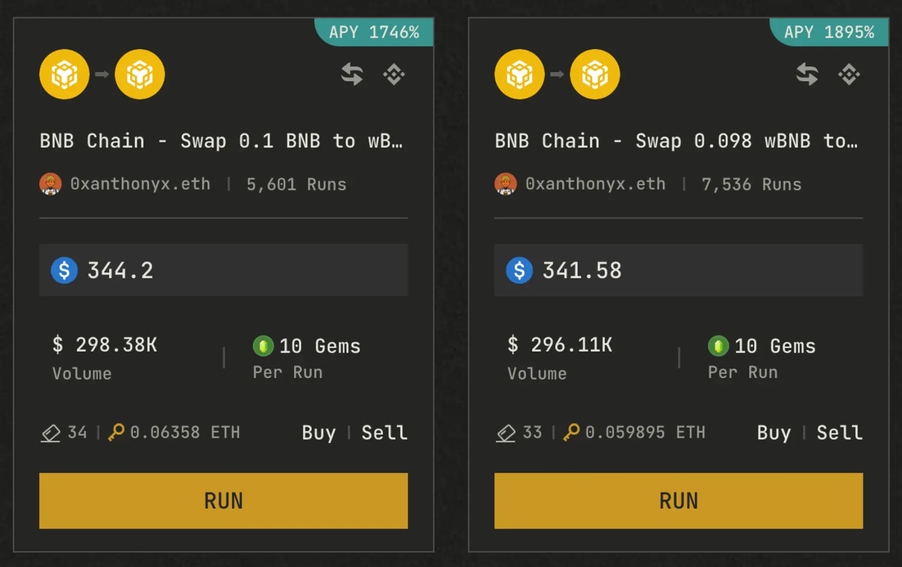 上图显示了两个 BQL 的交易对。在 BNB → WBNB 的方向上,总共 Mint 了 35 个 Key,价格已经从 0 涨到了 0.067 ETH。这个池子的本周的交易量为 297.48k,当前可瓜分的分红为 359 USDT。由于 BQL 的收益是每周累积的,每个 Key 每周的最终分红可达 40 USDT,相当于成本 0.067 ETH 的 30%,收益率可谓相当高。如果你以低于当前价格进入,实际获得的年化收益率会更高。