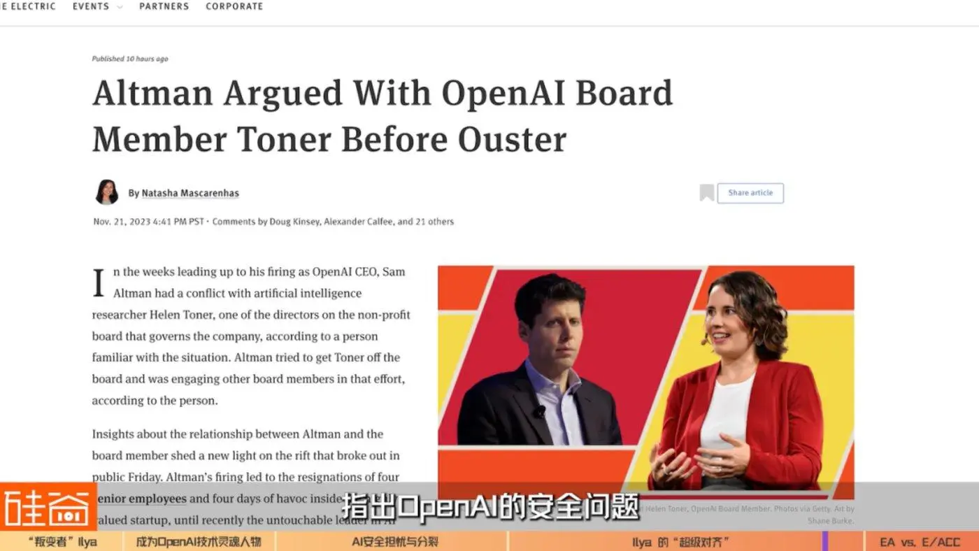 有效利他主义Effective Altruism,简称EA,目前是不少科技领袖和创业者们身上的标签,他们认为,如果生活在数千英里外的人很重要,那么生活在数千年之后的人们也同样重要,也就是说,**我们必须要被以后的人类,我们的后代来提前铺垫。**OpenAI董事会中的两名女性董事,曾经或目前深度参与过EA的慈善基金或组织,是非常明显的EA,也可以理解为AI保守派,希望重视AI安全。其中媒体也报道说,Helen因为之前的一篇研究文章中指出OpenAI的安全问题而表扬了对手Anthropic而跟Sam Altman起过争执。