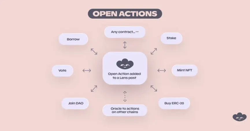 Lens V2引入了开放操作(Open Actions)功能,进一步增强了社交网络的可组合性,为用户和开发人员提供更多自由度和创造力。开放操作提供了一个开放的框架,允许开发人员直接在Lens中集成外部智能合约操作,从而在社交网络中创造出创新的体验。通过开放操作的可组合性,用户和开发人员可以根据自己的兴趣和需求,在Lens上选择不同的功能,并将它们组合在一起,创造出独特的社交体验。这为用户提供了更大的自由度,使他们能够参与到自己感兴趣的领域中,并与其他用户共享这些体验。开放操作的可组合性还为跨链操作提供了可能性。这意味着Lens上的用户可以与其他区块链网络进行互动,参与到不同的生态系统中。例如,用户可以通过Lens在Decentraland上购买土地,加入DAO或进行Gitcoin捐款。这种跨链操作将用户的社交网络扩展到了更广阔的区块链世界中,为他们带来了更多的机会和体验。