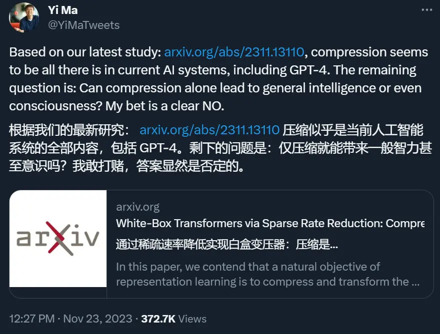近日,伯克利和香港大学的马毅教授领导的一个研究团队给出了自己的最新研究结果:包括 GPT-4 在内的当前 AI 系统所做的正是压缩。