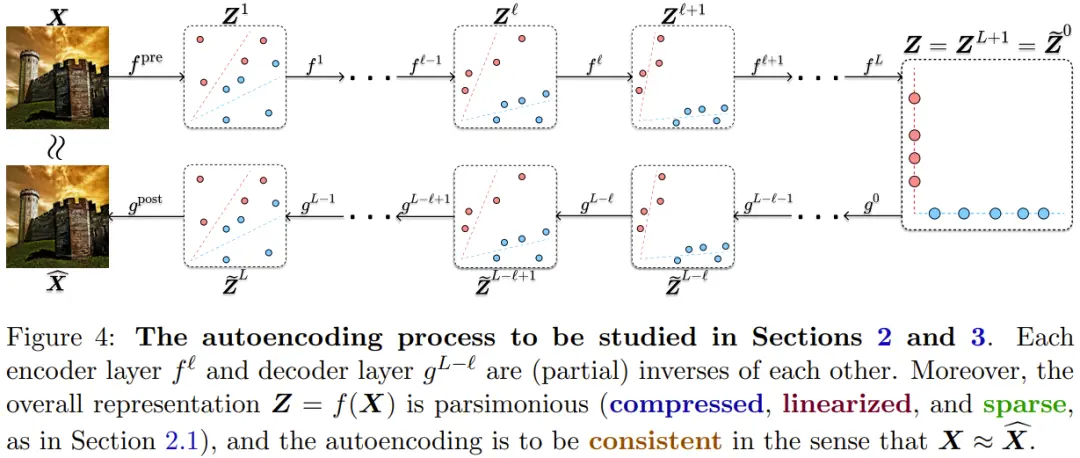 因此,可以将几乎完全一样的 CRATE 架构用于编码器、解码器或自动编码器。如图 4 给出了一个自动编码过程,其中每个编码层 f^𝓁 和解码层 g^{L-𝓁} 是(部分)可逆的。
