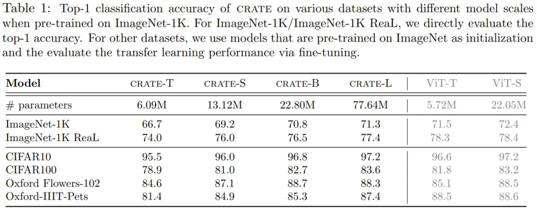 下表给出了不同大小的 CRATE 在不同数据集上的 Top-1 准确度。