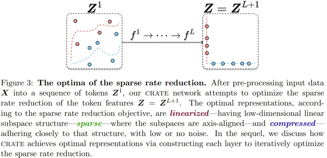 基于以上观察,他们提出了一个白盒深度网络理论。更具体而言,他们为学习紧凑和结构化的表征提出了一个统一的目标,也就是一种有原理保证的优良度度量。对于学习到的表征,该目标旨在既优化其在编码率下降方面的内在复杂性,也优化其在稀疏性方面的外在复杂性。他们将该目标称为稀疏率下降(sparse rate reduction)。图 3 给出了这一目标背后的直观思想。