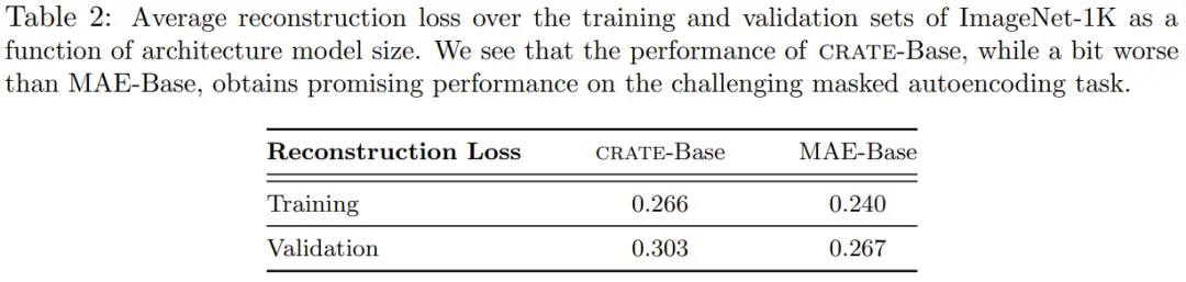 表 2 给出了 CRATE-Base 模型与 MAE-Base 模型在训练和验证集上的平均重建损失。