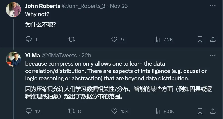 基于此,马毅教授还在 Twitter 上分享了一个有趣的见解:既然当前的 AI 只是在压缩数据,那么就只能学习到数据中的相关性 / 分布,所以就并不真正具备因果或逻辑推理或抽象思考能力。因此,当今的 AI 还算不是 AGI,即便近年来在处理和建模大量高维和多模态数据方面,深度学习在实验中取得了巨大的成功。