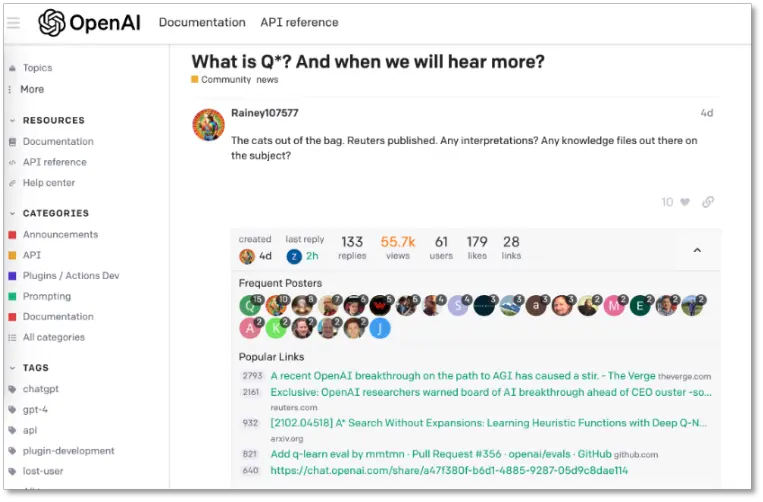 路透社的消息让外界对 OpenAI 的目光从人事纷争转移到它的主业上,连 OpenAI 的开发者社区都在追问 Q* 到底是什么,但未获得官方人员的回应。