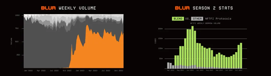 虽然目前 Blast 和 Blur 没有明确的关联,但 Blast 应被视为 Pacman 对 Blur 这一 NFT 交易市场扩张的一环,如同借贷平台 Blend。根据官方数据,在 S2 期间,Blur 实现了 61 亿美元交易量,超过 26 万名用户,平均占据 65% 市场份额,已稳稳超越了 OpenSea,成为 Ethereum NFT 交易市场的绝对龙头;而伴随着现货市场的站稳脚跟,Blur 旗下的借贷市场 Blend 也迅速占据了 NFT 借贷领域的主要份额,形成强者恒强的马太效应。Blur 和 Blend 已然占据了各自所属赛道的主要市场份额,且均实现自运转并能带来稳定收入,会成为未来持续扩张之路的基本盘,因此,并不存在一些悲观主义者认为的 Pacman 放弃 Blur 另起炉灶。