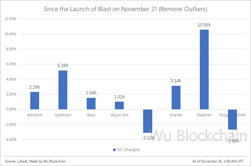 去掉极值后,图表更为清晰。包括 Arbitrum 和 Optimism 已经发币的成熟头部 L2 和备受期待的 Base、zkSync Era、Mantle 和 StarkNet 的 TVL 均是正增长。Blast 的出现对其他 L2 的影响可能比市场声音所认为的要小得多。