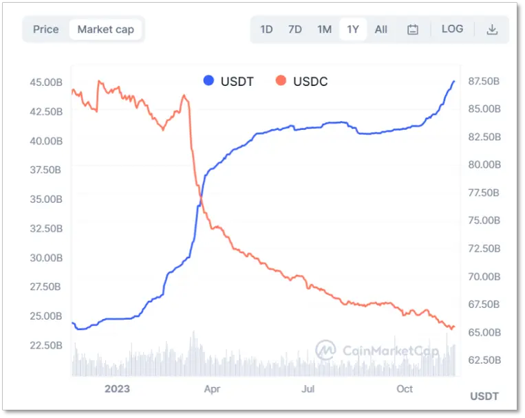 然而,进入 2023 年,USDT 再次占据上风,以 3.5 倍的市值优势将 USDC 甩开老远。按照 CoinMarketCap 的数据,分水岭在今年 3 月出现,USDC 遭遇了自发行以来最大的危机。