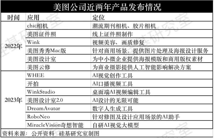**其次,在产品矩阵上,美图也开始聚焦细分赛道。**2022年至今,在自己擅长的影像赛道,美图推出了13款产品。比如,主打胶片和主题相机的Chic相机,Wink则关注视频美容和画质修复。同时,针对小B类专业级用户,美图推出了美图设计室和美图云修,前者商业图片设计,客群主要针对电商行业;后者则面向影楼行业,提供一站式AI修图能力。