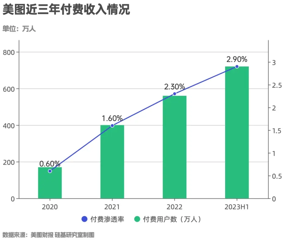 **最后在商业模式上,2020年下半年美图在国内推出VIP订阅服务,从免费转向订阅制。**仅从近三年财报基本面表现来看,订阅业务已超过在线广告业务成为美图首要的收入来源,订阅业务的付费渗透率也从2020年的0.6%攀升至2.9%。