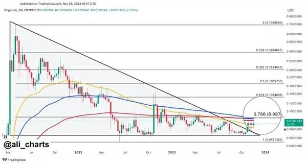 突破 0.087 美元的关口是狗狗币可能将当前价格翻倍的途径。交易员将乐观目标设定为 0.14 美元,预计如果狗狗币能够克服斐波那契水平和 EMA 收敛带来的技术挑战,价格将大幅上涨。
