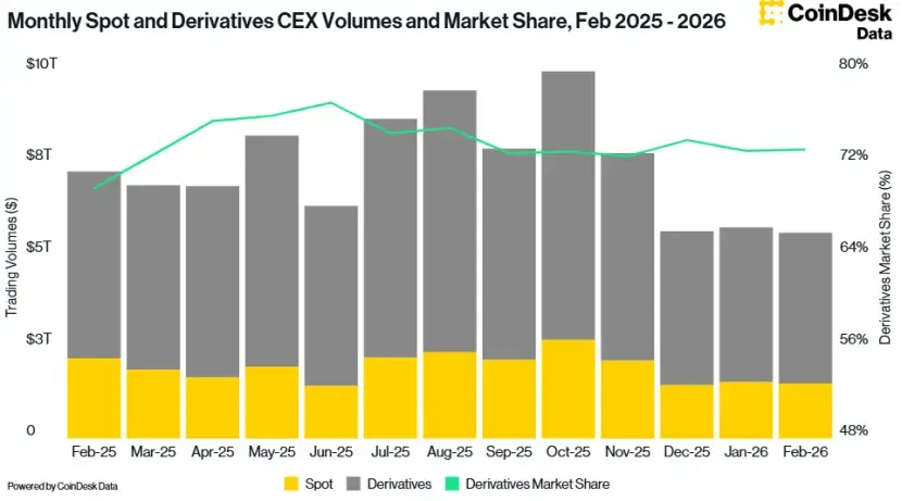 CoinDesk Data也显示,2月份CEX的总交易量下滑了2.41%,降至5.61万亿美元,这是自2024年10月以来的最低交易量。