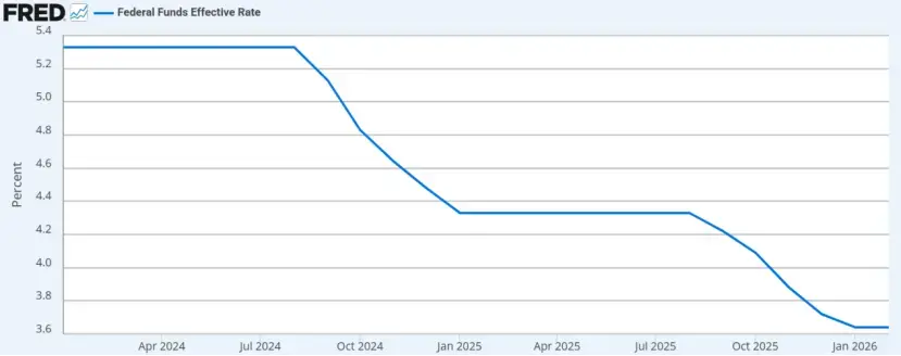 自2024年1月起,美联储联邦基金有效利率始终保持在3.6%以上的水平。尽管市场预期未来会有温和的降息路径,但目前的实际利率依然维持在相对高位。