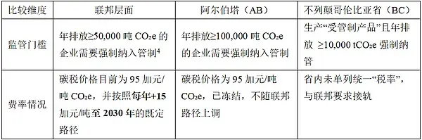 表:联邦层面、阿尔伯塔(AB)与不列颠哥伦比亚省(BC)碳税费率收费比较
