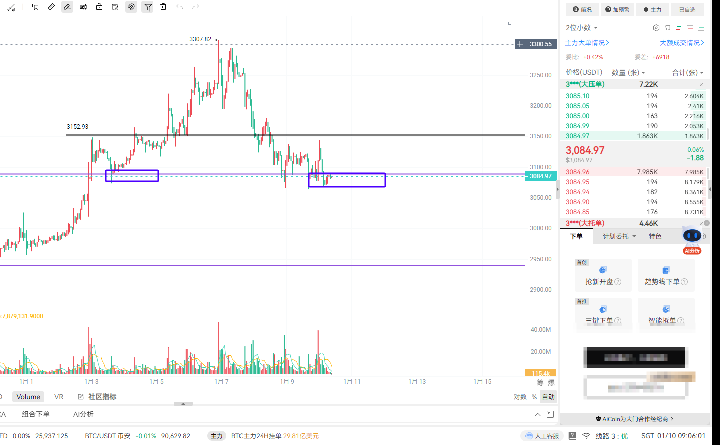 BTC:大饼昨天晚上也是在冲高91500附近后再次面临压力,上一篇文章中我们反复提示到大饼现在多头发力的==压力位就是要放量站稳91500.下方支撑90400附近==,没有跌破就是我们多单进场的位置,所以现在的大饼也好还是太太也好整体的趋势并没有出现明显的放量突破,一直在颈线附近形成箱体区间震荡,操作上就遵循一点,等到合适的位置,回踩不破支撑多单,突破压力位不放量就空。