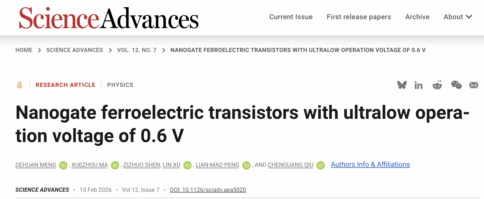 北京大学在非易失性存储器领域取得突破性进展。电子学院邱晨光-彭练矛团队首次提出“纳米栅超低功耗铁电晶体管”。团队通过精巧设计铁电存储的器件结构,引入纳米栅极电场汇聚增强效应,**研制出可在0.6V超低电压下工作的铁电晶体管,能耗降低至0.45 fJ/μm,并且将物理栅长缩减到1纳米极限,为国际上迄今尺寸最小、功耗最低的铁电晶体管,为构建高性能亚1纳米节点芯片和高算力AI芯片架构提供了更具潜力的新物理机制存储器件。**该突破性成果以“Nanogate ferroelectric transistors with ultralow operation voltage of 0.6 V ”为题,在线发表于Science子刊《科学·进展》(Science Advances)。
