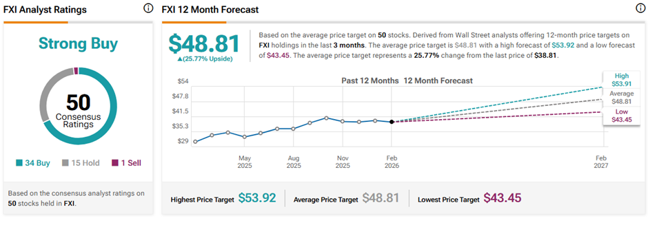 根据TipRanks独特的ETF分析师共识(基于对其持仓的分析师评级加权平均得出),FXI被评为强烈买入。市场的平均目标价为48.81美元,意味着上涨空间为25.8%。